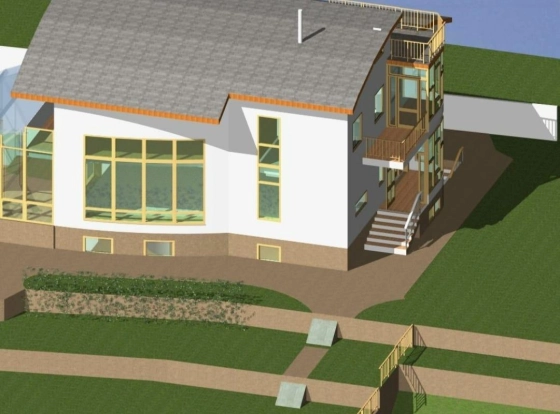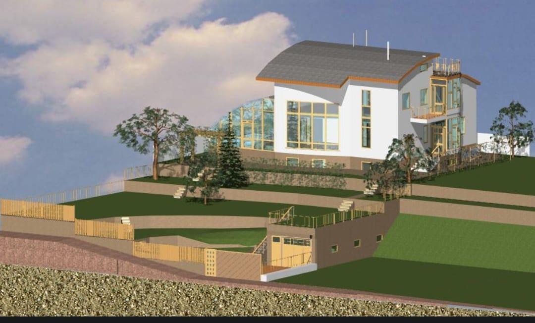 Участок в двух уровнях. На нижнем гараж-75м2, из него крытая лестница на второй уровень. Счётчик, все оформлено. Газ по границе участка. Вода подключена к водоводу. Колодец канализации на участке. Из подземного хода возле гаража слева небольшой погребок. Есть проект дома.